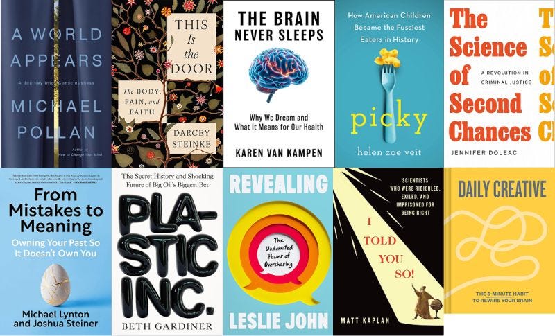 Blythe Henwood Harris & Mallory May, Daily Creative: The 5-Minute Habit to Rewire Your Brain, Leslie John, Revealing: The Underrated Power of Oversharing, Karen van Kampen, The Brain Never Sleeps: Why We Dream and What It Means for Our Health, Michael Lynton & Joshua Steiner, From Mistakes to Meaning: Owning Your Past So It Doesn't Own You, Matt Kaplan, I Told You So!: Scientists Who Were Ridiculed, Exiled, and Imprisoned for Being Right, Helen Zoe Veit, Picky: How American Children Became the Fussiest Eaters in History, Jennifer Doleac, The Science of Second Chances: A Revolution in Criminal Justice, Darcey Steinke, This Is the Door: The Body, Pain, and Faith, Beth Gardiner, Plastic Inc.: The Secret History and Shocking Future of Big Oil's Biggest Bet, Michael Pollan, A World Appears: A Journey into Consciousness.