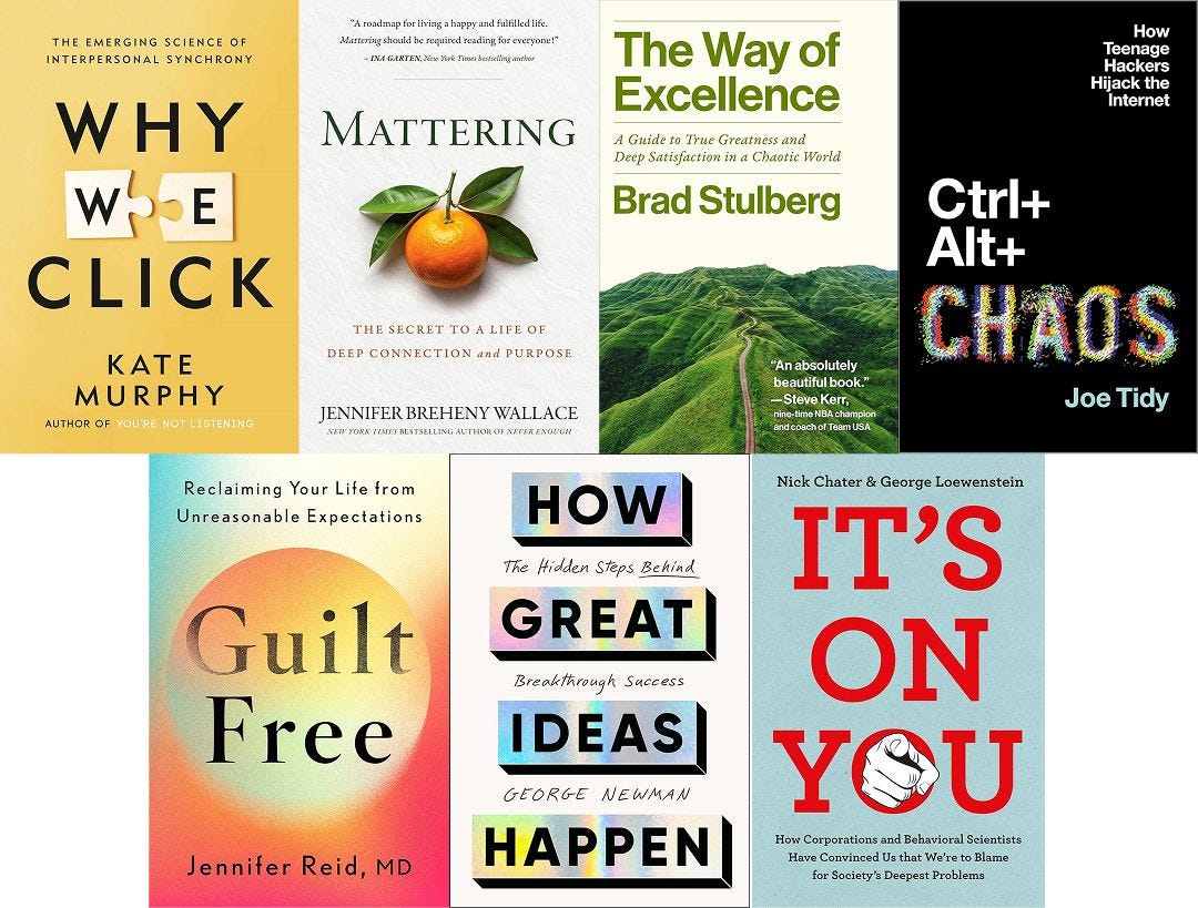This week, several Next Big Idea Club Must-Read authors celebrated the publication of their books--congratulations to them all! 📖 Join us in reading and discussing these exciting new releases: Guilt Free: Reclaiming Your Life from Unreasonable Expectations by Jennifer Reid, MD, Why We Click: The Emerging Science of Interpersonal Synchrony by Kate Murphy, It’s on You: How Corporations and Behavioral Scientists Have Convinced Us That We’re to Blame for Society’s Deepest Problems by Nick Chater & George Loewenstein, Ctrl + Alt + Chaos: How Teenage Hackers Hijack the Internet by Joe Tidy, The Way of Excellence: A Guide to True Greatness and Deep Satisfaction in a Chaotic World by Brad Stulberg, How Great Ideas Happen: The Hidden Steps Behind Breakthrough Success by George Newman, and Mattering: The Secret to a Life of Deep Connection and Purpose by Jennifer Breheny Wallace.