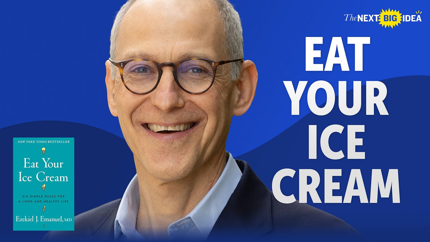 Do you ever feel like you’re drowning in health advice? Eat this, not that. Take this supplement, but only after popping this other one first. Here’s the good news: Most of it doesn’t matter. In Eat Your Ice Cream, renowned physician Ezekiel Emanuel shares six simple rules for living longer — and gives you permission to ignore pretty much everything else. Listen to our conversation with Zeke on Spotify or Apple Podcasts.