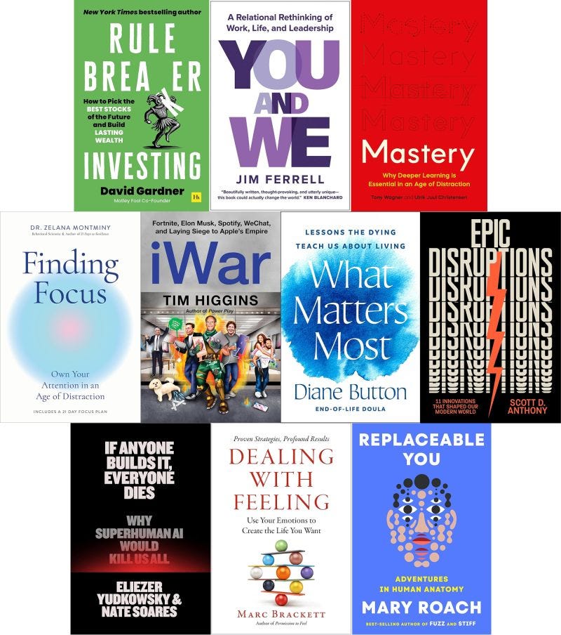 We’ve got a new batch of must-reads that hit stores this week, from authors like Mary Roach (Replaceable You), Eliezer Yudkowsky & Nate Soares (If Anyone Builds It, Everyone Dies), David Gardner (Rule Breaker Investing), Jim Ferrell (You and We), Tony Wagner & Ulrik Juul Christensen (Mastery), Dr. Zelana Montminy (Finding Focus), Tim Higgins (iWar), Diane Button (What Matters Most), Scott D. Anthony (Epic Disruptions), and Marc Brackett (Dealing With Feeling).