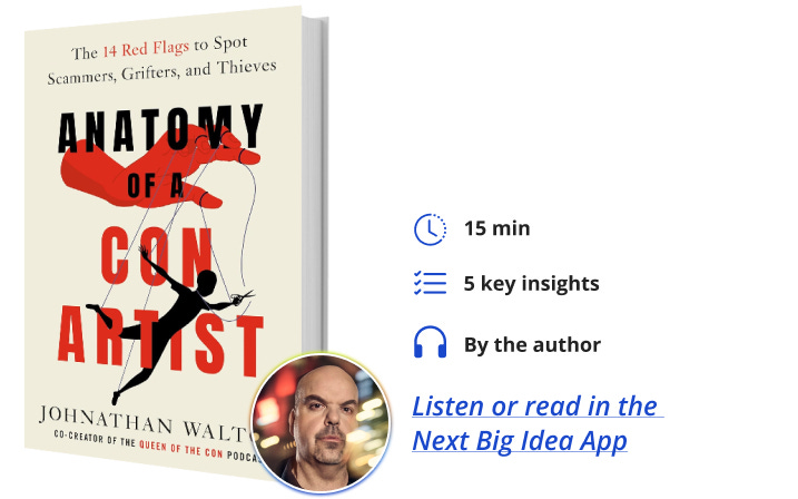 If you think you’d never fall for a scam, I’ve got bad news: that’s exactly what scammers want you to think. The truth is, con artists don’t outsmart you—they out-feel you, playing on your emotions until you can’t see the red flags waving right in front of your face. Emmy-winning TV producer and host of Queen of the Con Johnathan Walton knows this firsthand—he lost nearly $100,000 to a scammer he thought was his best friend. In his new book Anatomy of a Con Artist: The 14 Red Flags to Spot Scammers, Grifters, and Thieves, he shows how to spot the tricks before they spot you. Pick up a copy on Amazon or listen to Johnathon’s audio summary in the Next Big Idea app.