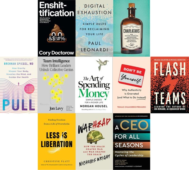 Guys, dust off that nightstand because a bunch of new Must-Reads just hit the bookstores, including Enshittification by Cory Doctorow, Digital Exhaustion by Paul Leonardi, Charlatans by Moises Naim and Quico Toro, Pull by Brennan Spiegel, Team Intelligence by Jon Levy, The Art of Spending Money by
