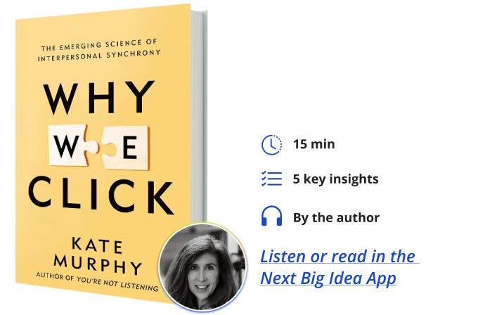 Humans are instinctively wired to sync with one another, and this invisible alignment of bodies, brains, and emotions shapes attraction, trust, and belonging. It can deepen connection and fuel cooperation, but it also makes feelings and behaviors contagious, giving each of us more influence over others than we realize. Kate Murphy is a journalist whose work has appeared in the New York Times, The Wall Street Journal, Economist, and Texas Monthly, among other publications and her new book is called Why We Click: The Emerging Science of Interpersonal Synchrony. Check out her summary on the Next Big Idea app.