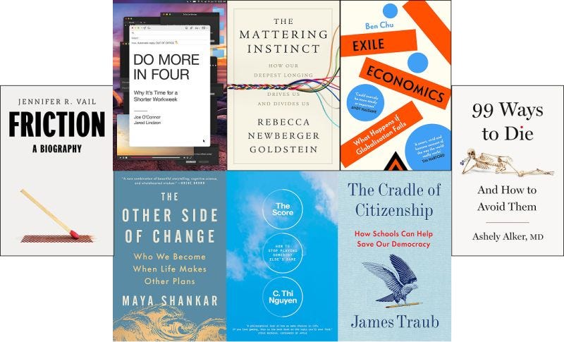 The second week of January saw a bunch of exciting new non-fiction, including Friction: A Biography by Jennifer Vail, Do More In Four by Jared Lindstrom and Joe O'Connor, The Mattering Instinct by Rebecca Newberger Goldstein, Exile Economics by Ben Chu, 99 Ways to Die by Ashely Alker MD, The Other Side of Change by Maya Shankar, The Score by C. Thi Nguyen, and The Cradle of Citizenship by James Traub. Congratulations to all!